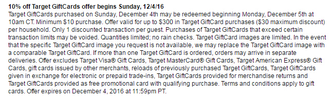 每年年底有一天可以九折在target买礼品卡。今年是12月4日到5日中部时间上午10点,目前target官网已经给了正式的公告:
