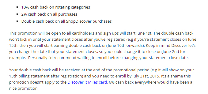 <p>éå¸¸è¯±äººææ¨æï¼å¦æé ådiscoverå®¶æ¯ä¸ªå£åº¦çrotating categoriesçè¯ï¼æ¯ä¸ªææä»¬å¯ä»¥äº«åé«è¾¾10%çcash backãä¸é¢çå 容èèå§highlight两ç¹å¤§å®¶è¦æ³¨æï¼(1) è¿ä¸ªpromotion䏿¯é»è®¤æçï¼éè¦sign up; (2) sign upçæ¶é´ä»6æ1æ¥å¿ç«¥èå¼å§ï¼ä½ä½ å¯ä»¥ä½¿ç¨è¿ä¸ªpromotionçæ¥åå¿ é¡»çå°ä½ ä¸ä¸ä¸ªstatementå¼å§ã</p>
