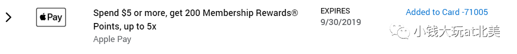 apple pay满$5给200MR,可以用5次。easy money。现在很多地方都收apple pay了。不过可以用的超市比较少?costco可以用,但是不收amex卡。印象中可能饭店比较多,比如麦当劳。希望有读者能推荐一些不错的刷$5的地方。