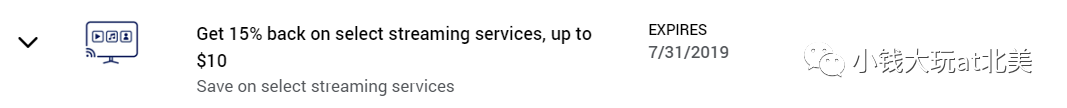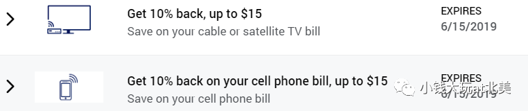 下面这几个offer差不多属于同一类。分别是streaming service(订阅的视频服务,比如Hulu)15%返现(最多$10),cable or satelite TV bill(最多$15),以及cell phone bill的10%返现,最多$15