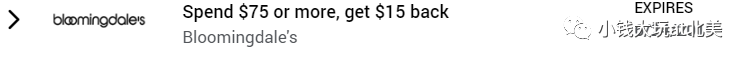 Bloomingdales满$75减$15。喜欢买东西的妹子应该都很喜欢这家吧,大部分州都不收税,直接上来相当于先有了9折。配合他家时不时的活动,尤其合适。