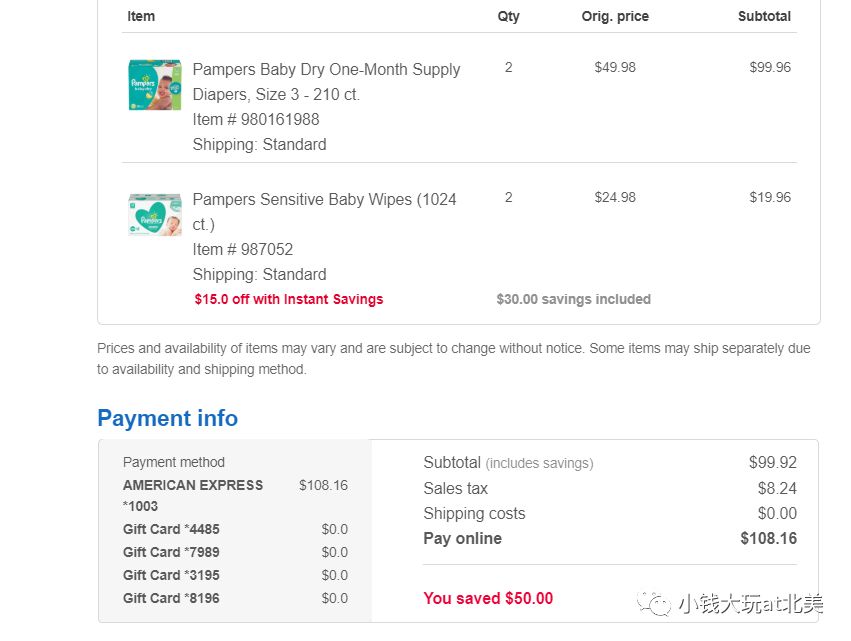 可以看到,我结算的时候用的是信用卡。其实手上还有囤的礼品卡,只是正好需要完成开卡奖励。sam’s club/沃尔玛礼品卡是刚需,以后反正还有机会用,就直接刷的信用卡。如果把手上囤的礼品卡用上(按8折估算吧,有的是五折屯来的),差不多就是半价买东西了。