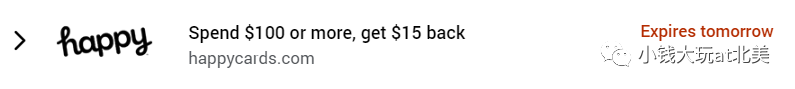 在happycards花$100立返$15。也有mr点数的版本。是的,明天过期!所有有这个offer的朋友,请抓紧!我自己下单以后,是秒收到amex的确认邮件。