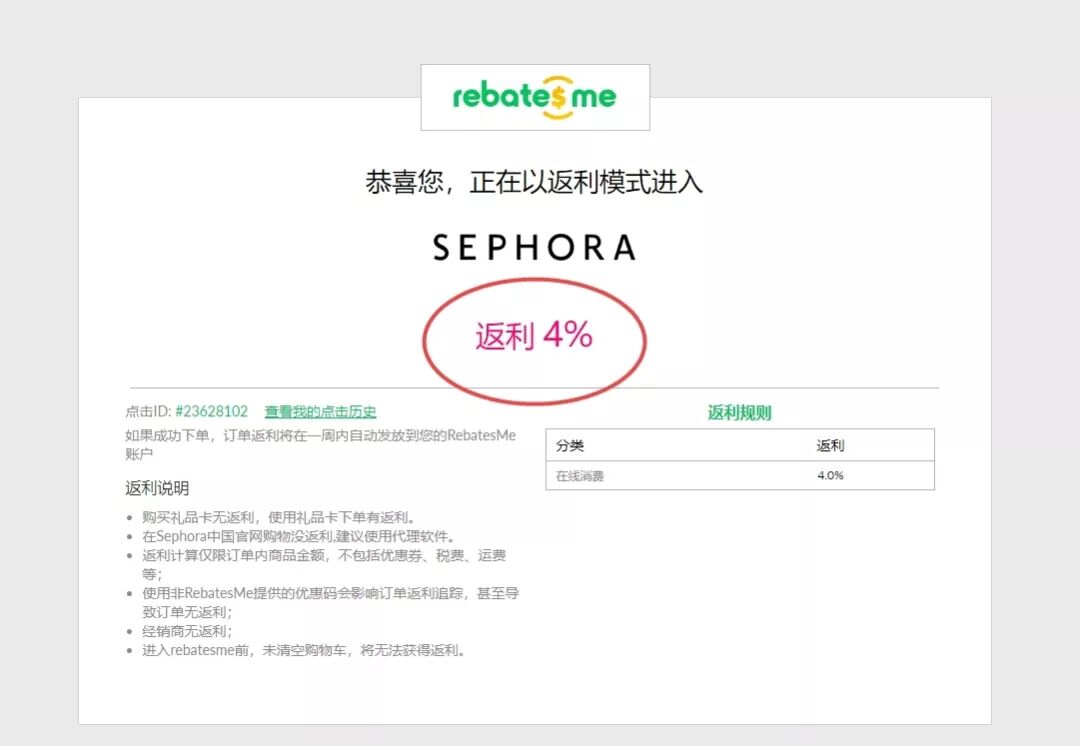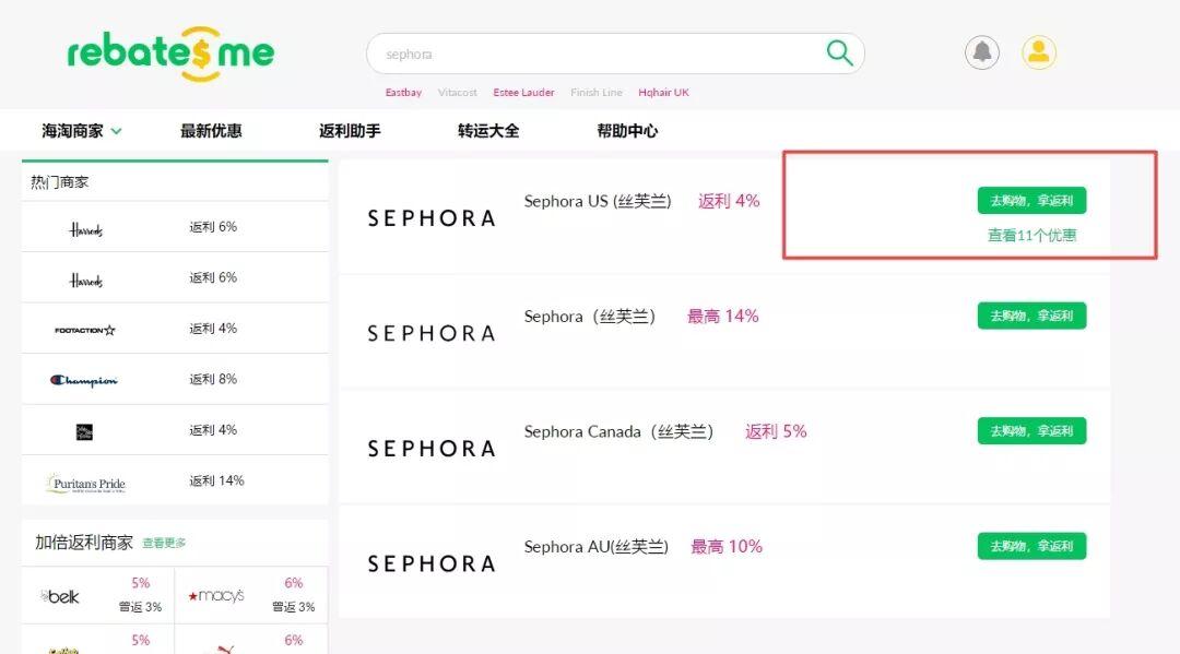 点击Sephora US后面的绿色按钮,会以返利模式进入他家主页
