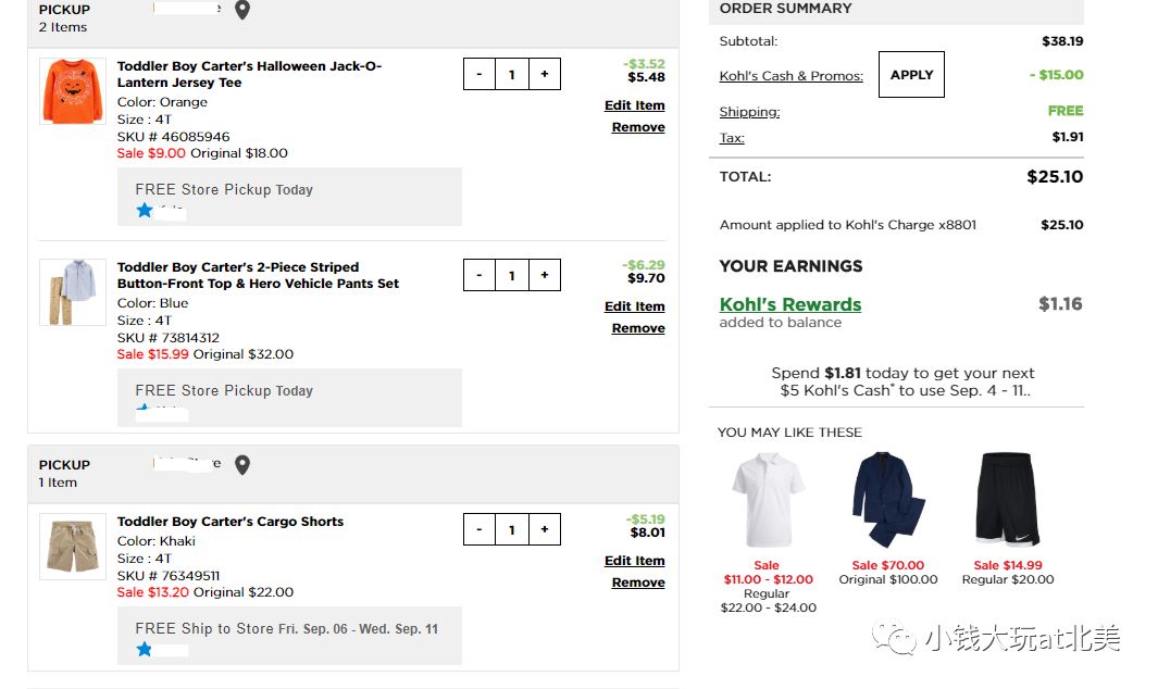 一件长袖,一条短裤,和一套长袖衬衫, 满$25减$10,然后我自己账户里还有以前攒下的$5 kohls cash,总共给出去$25+,然后又拿回$5 kohls cash。同时走ebates有6%返现,所以又有$1.5返回来。