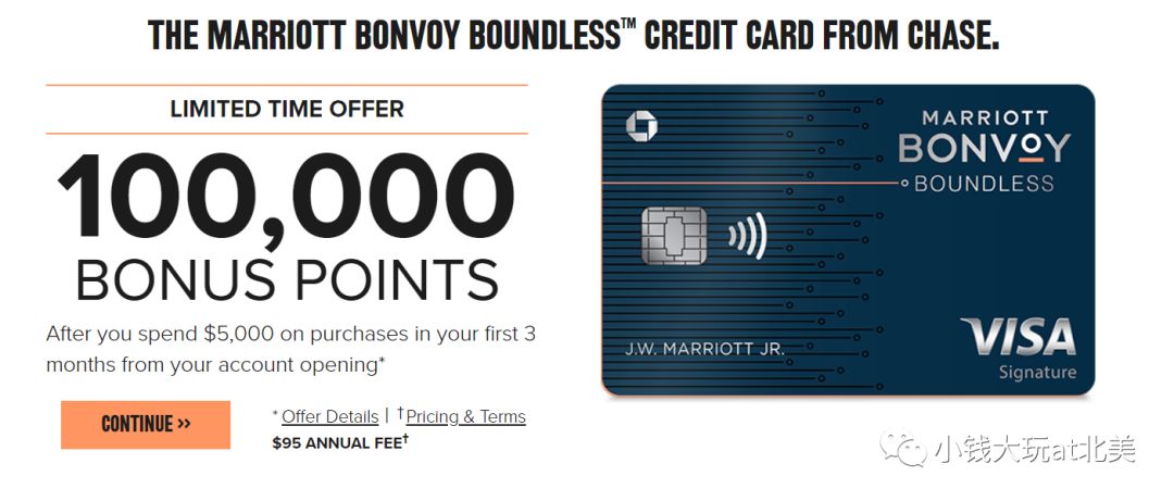 开卡3个月内消费满$5,000给100k点的万豪积分。目前这个offer是限时的,截止日期就在今天!此卡原来叫做 Chase Marriott Premier Plus。