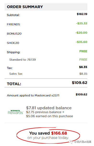 order confirmation其实帮我算了,总共付$101.27 (tax也不算了,每个地方不同),节省了$166.68。另外拿到了$20的kohls cash和$5.06的kohls reward,以及$10.1的ebates返现。实际out of pocket是$66.11,总价$267.95,相当于25折。