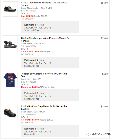 好了,现在来算算我一共节省了多少钱?几折拿下的这三双clarks的鞋子(carters衣服很便宜就直接忽略不计了)?
