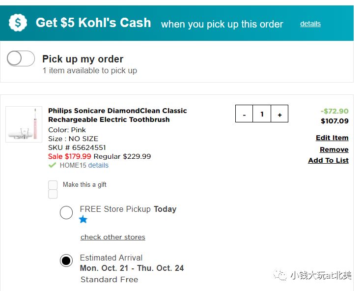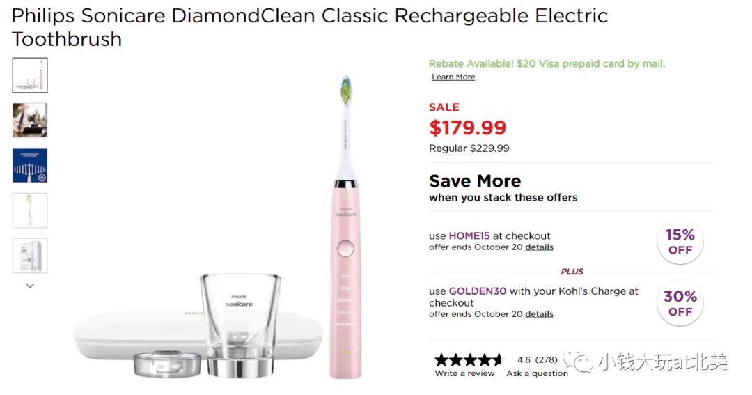 另外不要忘记,实战分析 | Kohl’s现在可以25折不到买品牌鞋子!跳这个deal的时候有送kohls cash。比如我拿了$20,也可以是用在这个上面的(友情提醒下,上次这个deal的kohls cash是明天16号过期哦!)。所以最后也就给了$40左右就可以拿下传说中的女神牙刷了哦!哈哈。