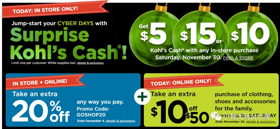 kohl’s家黑五的活动是到11月29日,30日(今天)开始就是cyber monday的活动了。它家新一轮的活动主要是: