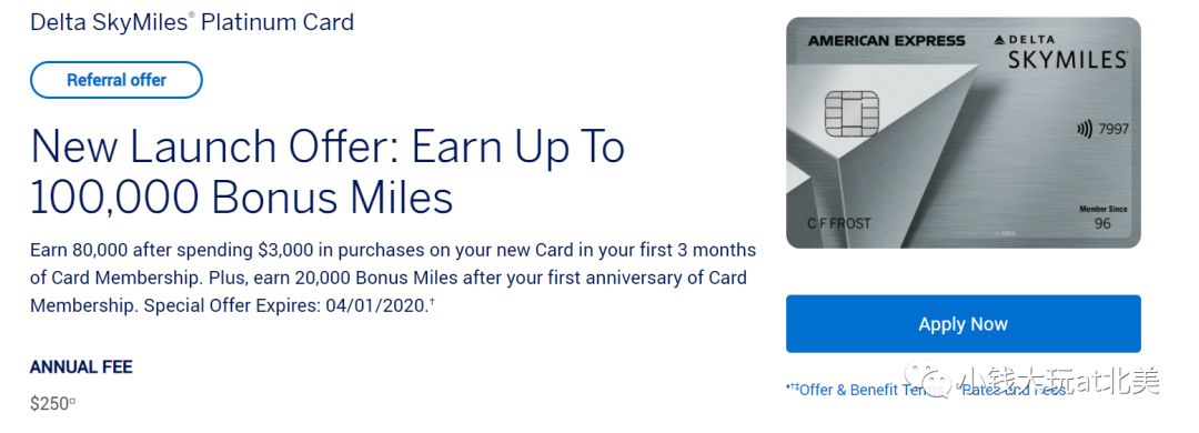 开卡奖励:三个月消费满$5000,给80,000里程;第一个持卡周年再赠送20,000里程。总共,100k里程。年费$250。