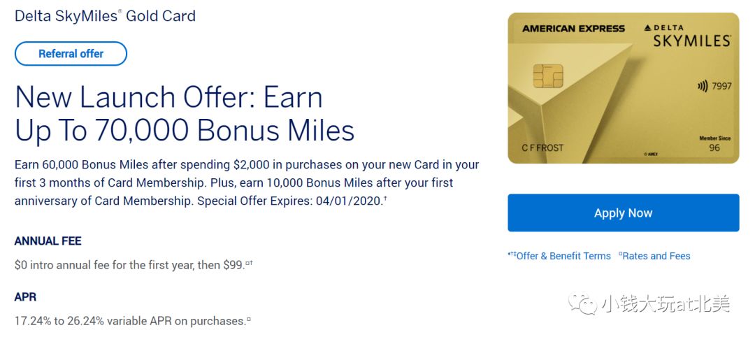 开卡奖励:三个月消费满$2000,给60,000里程;第一个持卡周年再赠送10,000里程。总共70k里程。年费$99。