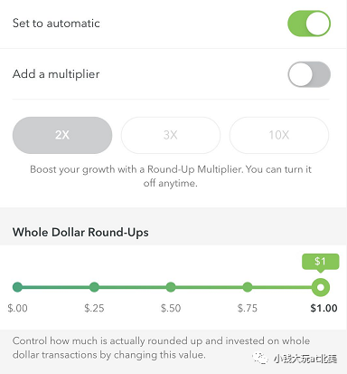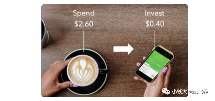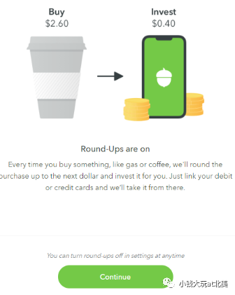 acrons家比较著名的就是round up program。通过绑定账户之后,比如你的卡在星巴克消费了$2.6,那acrons就会round up最近的整数,那差值的$0.4就会打入到你的账户里进行投资。下面会细说。