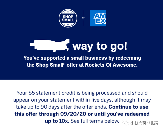 结束了吗?没有,因为这个商家还属于small business!!!如果你加了这个amex offer的卡正好和我一样还加了shop small(详情见:amex发的$50这么容易拿!),满$10返$5,结果我还拿了一个: