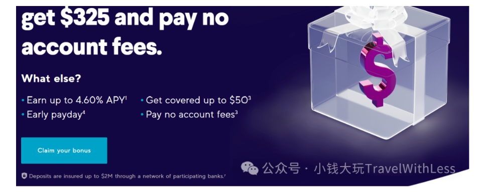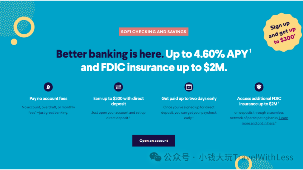 SoFi家提供银行、信用卡、贷款、股票等多种financial服务,是FIDC insured,大家可以放心。今天这里分享是银行账户的$300开户奖励,外加存款本身up to 4.6% APY哦!!