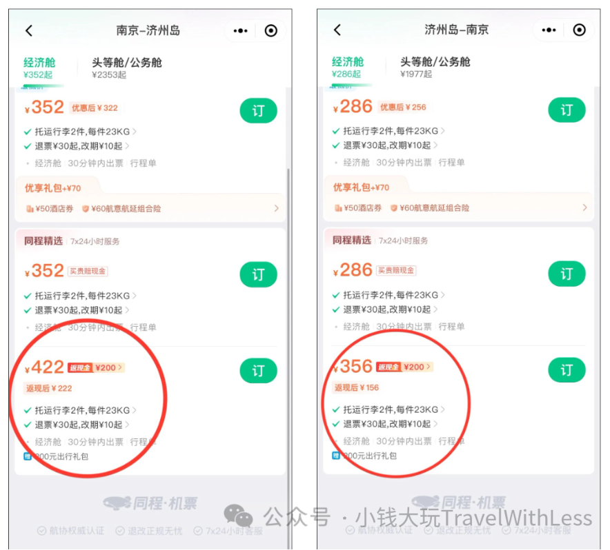 这个是从国内的几个微信公众号看来的。国内不少城市最近往返济州岛只的机票只要小几百人民币,带免费托运行李(两件2×23 kg),其中以我在的南京最便宜: