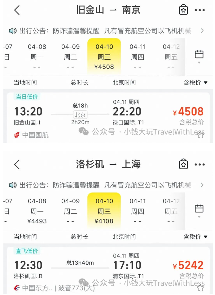 这几天在关注大概三四月份美国回中国的机票。家里老人往返的时候我一般都尽量安排三四月份/九十月份,因为是淡季,价格都便宜不少。目前看到美西出发的很多直飞航班,大概只要4000多RMB就可以。