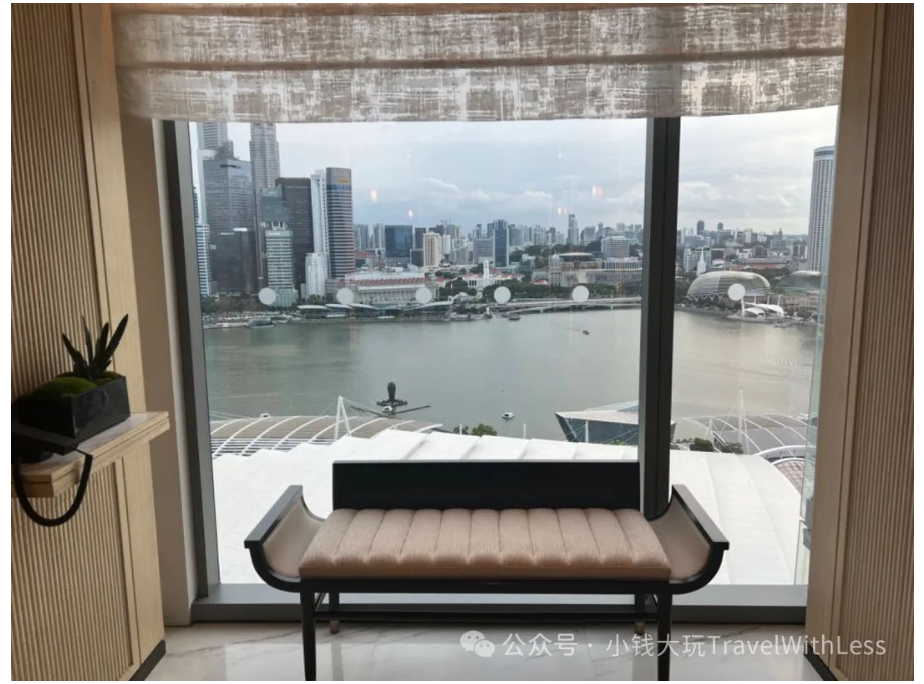 金沙现在有一部分翻新过,一部分没有翻新,这里图片再走下细节。一共三个塔楼,基本上都是从T1这边进,我们住T2,是翻新过的,从电梯出来看向鱼尾狮公园的景色: