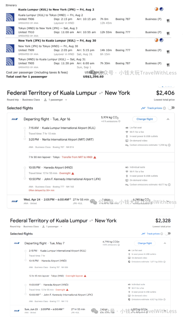 这个是要预定从马来西亚KUL机场出发,经日本东京(大部分NRT也有HND)转机,到美国的城市(LAX/SFO/JFK)等,只需要2000多美金。可以直接从google flights搜索,从美联航网站,预订日本全日空,比如: