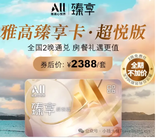 首先购买雅高超悦版臻享卡(ALL PLUS CHINA),以获得30个等级房晚,售价2388元。注意,必须先购买臻享卡,以免影响其他卡片带来的房晚累加效果。