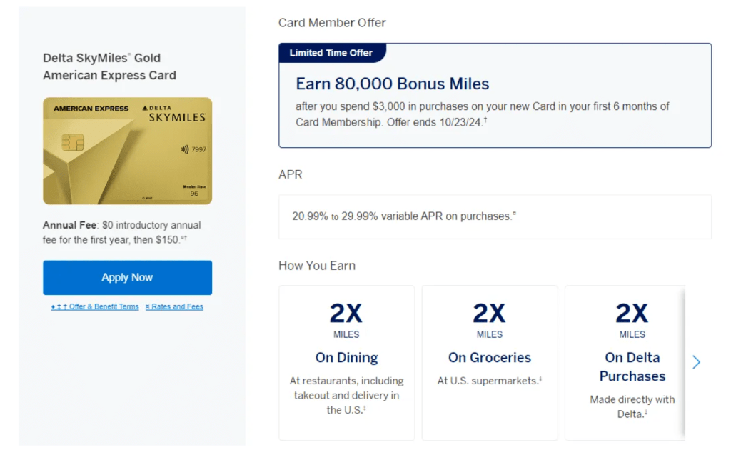 开卡6个月内消费满$3,000给80,000 Delta Miles。赠送的里程现金价值就高达$960。